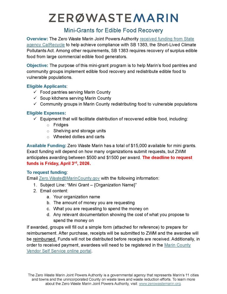 The purpose of this mini-grant program is to help Marin’s food pantries and community groups implement edible food recovery and redistribute edible food to vulnerable populations.